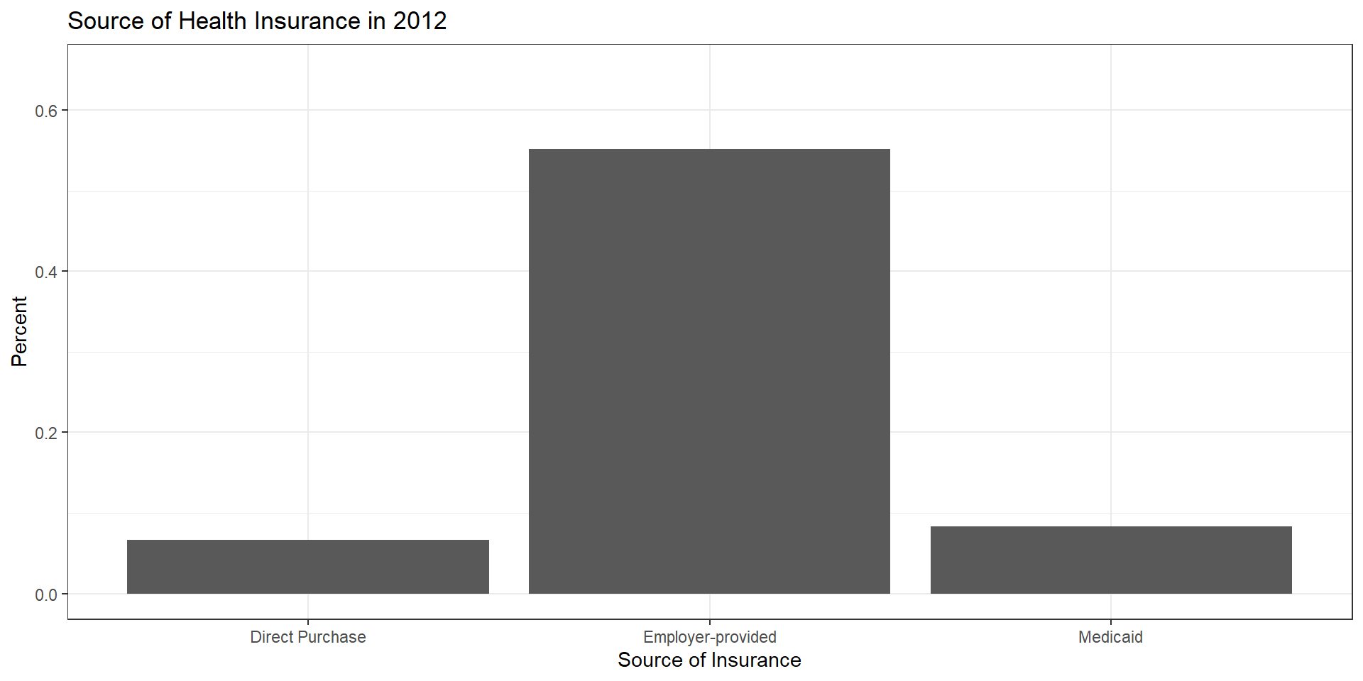 ins.dat %>%filter(year==2012) %>%pivot_longer(c("perc_employer","perc_direct","perc_medicaid")) %>%select(State, name, value) %>%group_by(name) %>%summarize(mean=mean(value)) %>%ggplot(aes(x=name, y=mean)) +geom_col() +ylim(0,0.65) +labs(x="Source of Insurance",y="Percent",title="Source of Health Insurance in 2012" ) +theme_bw() +scale_x_discrete(labels=c('perc_direct'='Direct Purchase','perc_employer'='Employer-provided','perc_medicaid'='Medicaid'))