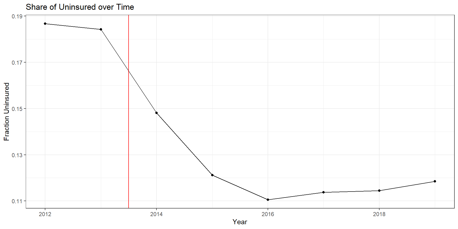 ins.dat %>%group_by(year) %>%summarize(mean=mean(perc_unins)) %>%ggplot(aes(x=year,y=mean)) +geom_line() +geom_point() +theme_bw() +labs(x="Year",y="Fraction Uninsured",title="Share of Uninsured over Time" ) +geom_vline(xintercept=2013.5, color="red")