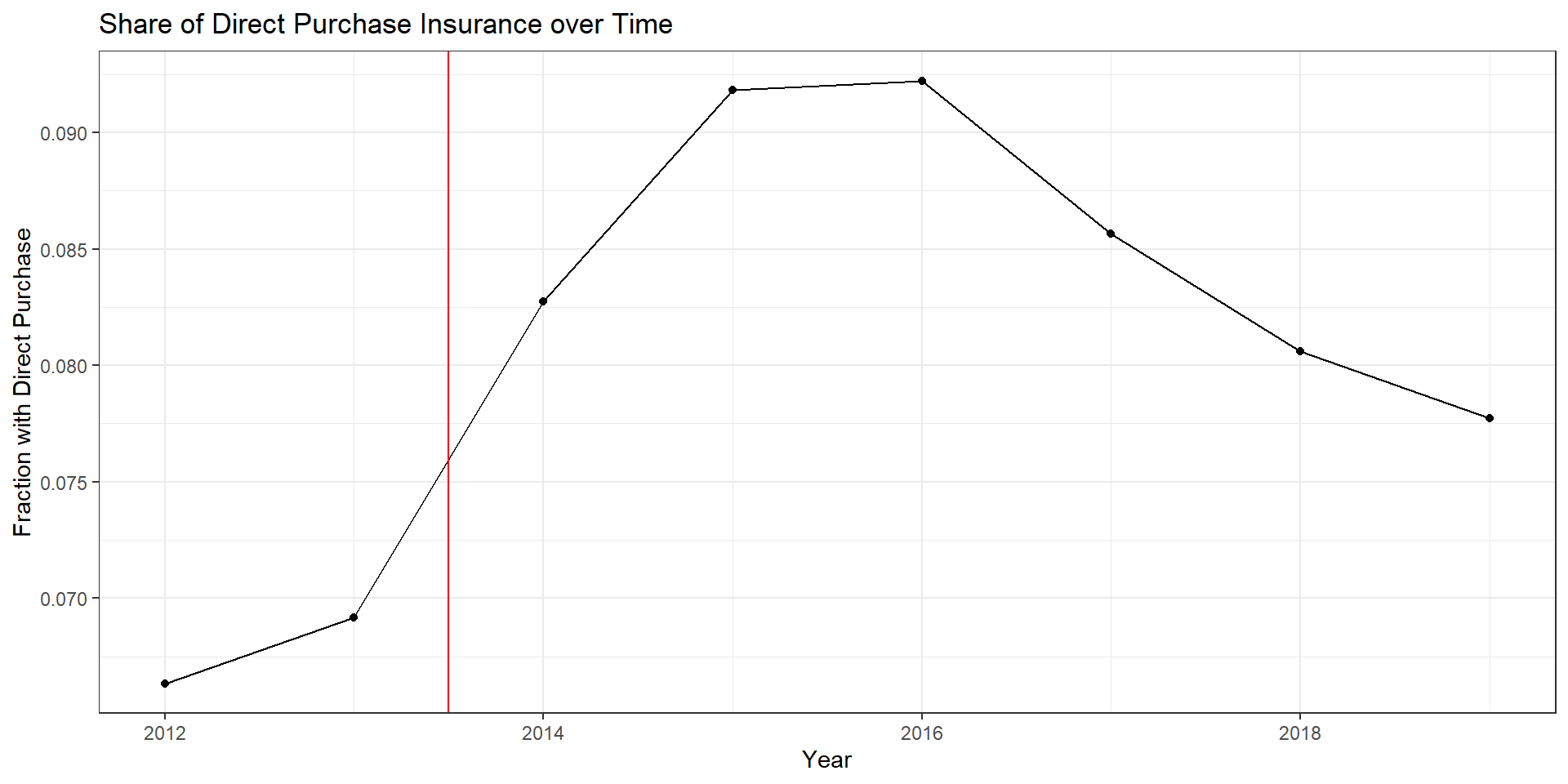 ins.dat %>%group_by(year) %>%summarize(mean=mean(perc_direct)) %>%ggplot(aes(x=year,y=mean)) +geom_line() +geom_point() +theme_bw() +labs(x="Year",y="Fraction with Direct Purchase",title="Share of Direct Purchase Insurance over Time" ) +geom_vline(xintercept=2013.5, color="red")