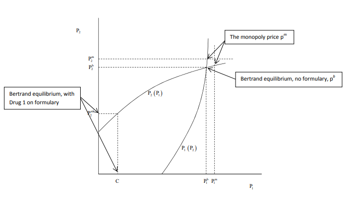 Firm 1: \[p_{1}^*(p_{2}) = \frac{a + cp_{2} + mc_{1}}{2b + 1}\] Firm 2: \[p_{2}^*(p_{1}) = \frac{a + cp_{1} + mc_{2}}{2b + 1}\]